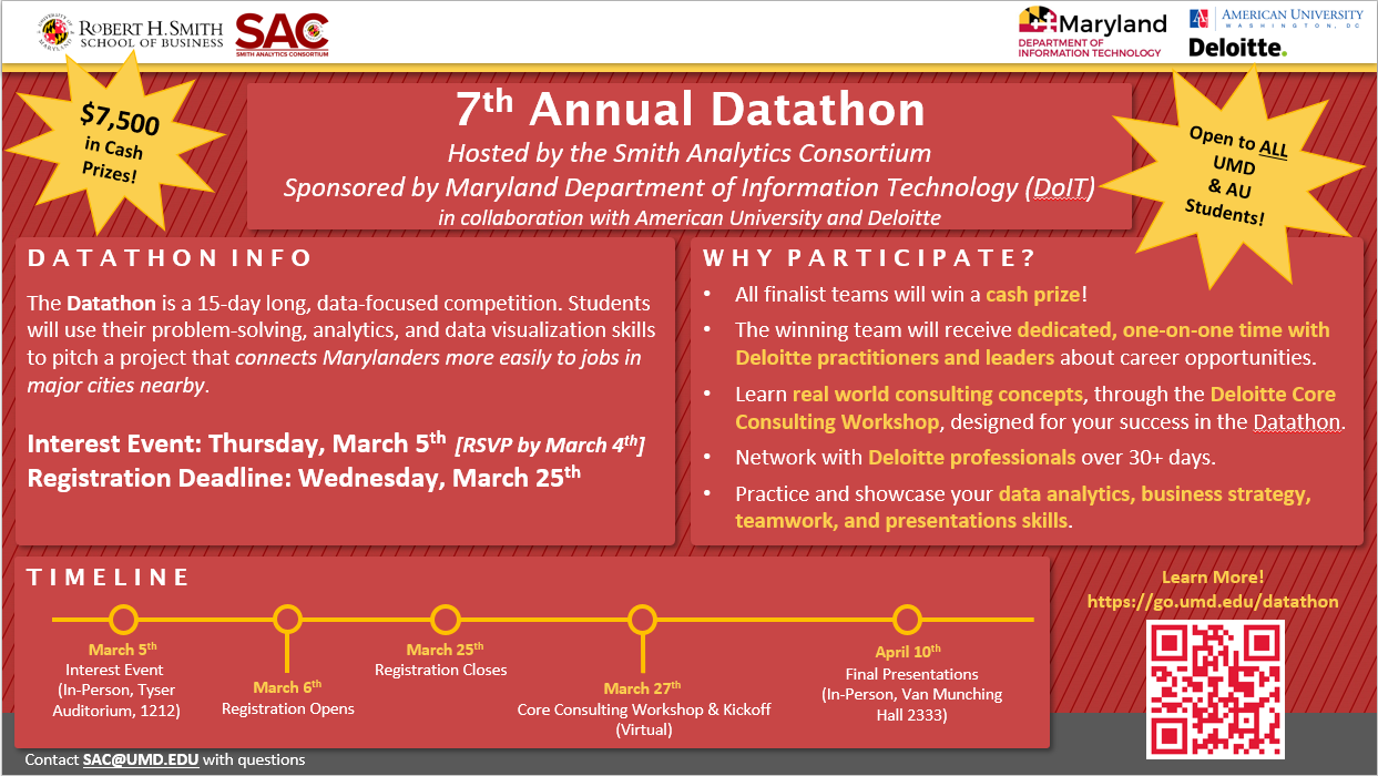 The Datathon, open to ALL University of Maryland and American University students, is a 15-day-long, data-focused competition. Students will use their problem-solving, analytics, and data visualization skills to pitch a project that connects Marylanders more easily to jobs in major cities nearby.